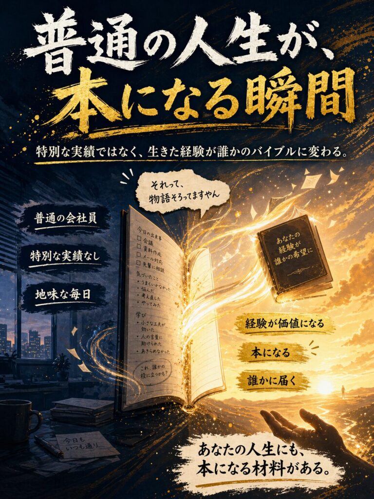 「自分には特別な経験がない」と思っていませんか?普通の会社員の経験こそ、AI時代の希少資産です。Kindle出版で人生を本にするための3つの条件と、今日からできる棚卸し3ステップを公開します。